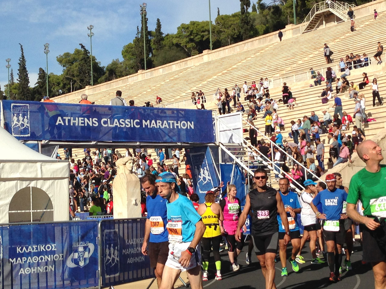 I did not photograph the runners as they were praying to their gods. Or the man who kept running barefoot, in pain yet determined to reach and cross the termination line at the historic Kallimarmaron Stadium.